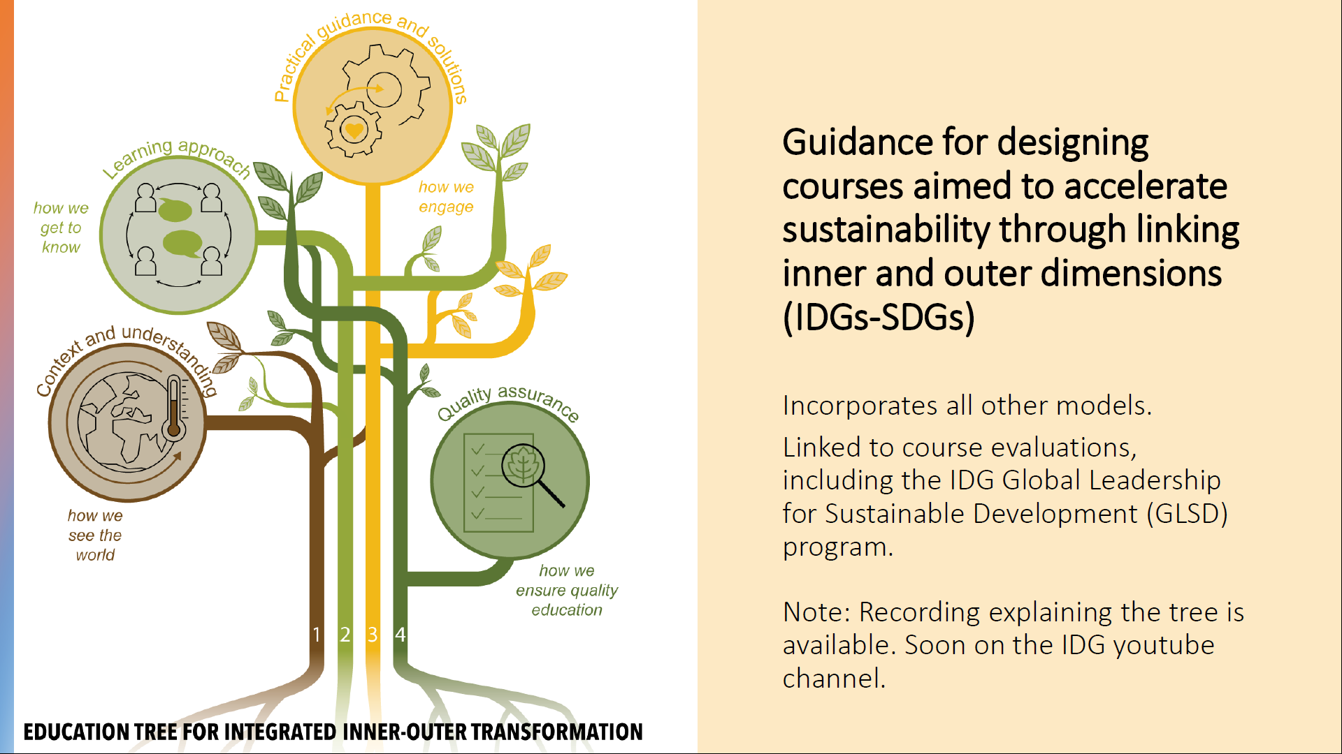 ต้นไม้แห่งการศึกษาเพื่อการเปลี่ยนแปลงภายในและภายนอกแบบบูรณาการ (Education Tree for Integrated Inner-Outer Transformation) เป็นเครื่องมือแนะแนวทางสำหรับการออกแบบหลักสูตรที่มุ่งเร่งการเปลี่ยนแปลงสู่ความยั่งยืนและการฟื้นฟู (sustainability and regeneration) โดยการเชื่อมโยงมิติภายในและภายนอกเข้าด้วยกัน โมเดลนี้ใช้ต้นไม้เป็นสัญลักษณ์ของการเติบโตและการเชื่อมโยง โดยรากที่มองไม่เห็นเปรียบเสมือนโลกภายในของเรา (inner world) ส่วนลำต้น กิ่ง และใบที่มองเห็นได้ เปรียบเสมือนโลกภายนอก (outer world) การที่ต้นไม้จะดำรงอยู่ได้ ทั้งสองส่วนนี้ต้องอยู่ร่วมกันและได้รับความใส่ใจเท่าเทียมกัน ต้นไม้แห่งการศึกษานี้สรุปมาจากผลการวิจัยหลายปีในสาขานี้ ซึ่งได้รับการตีพิมพ์ในปี 2024 และได้มีการปรับปรุงรูปแบบการนำเสนออย่างต่อเนื่อง รวมถึงเกิดจากการประเมินคอร์สที่พัฒนาโดย Inner Green Deal, UNDP และ Inner Development Goals (IDGs และ Global Leadership for Sustainable Development Program)