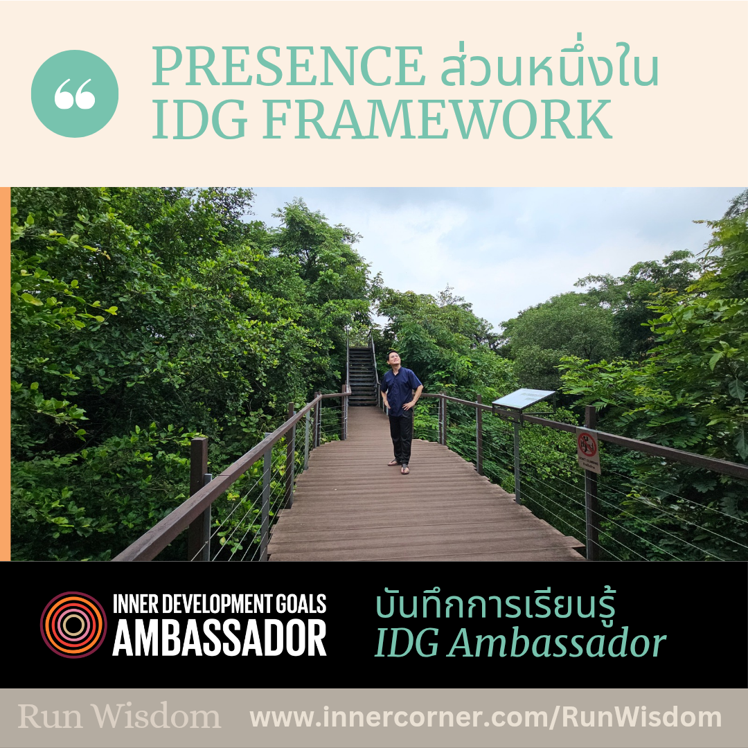 Presence แปลว่า การดำรงอยู่ในปัจจุบัน – ความสามารถในการดำรงอยู่ ณ ที่นี่และขณะนี้ โดยไม่ตัดสิน และอยู่ในสภาวะของปัจจุบันอย่างเปิดกว้าง เป็นส่วนหนึ่งใน IDG Framework