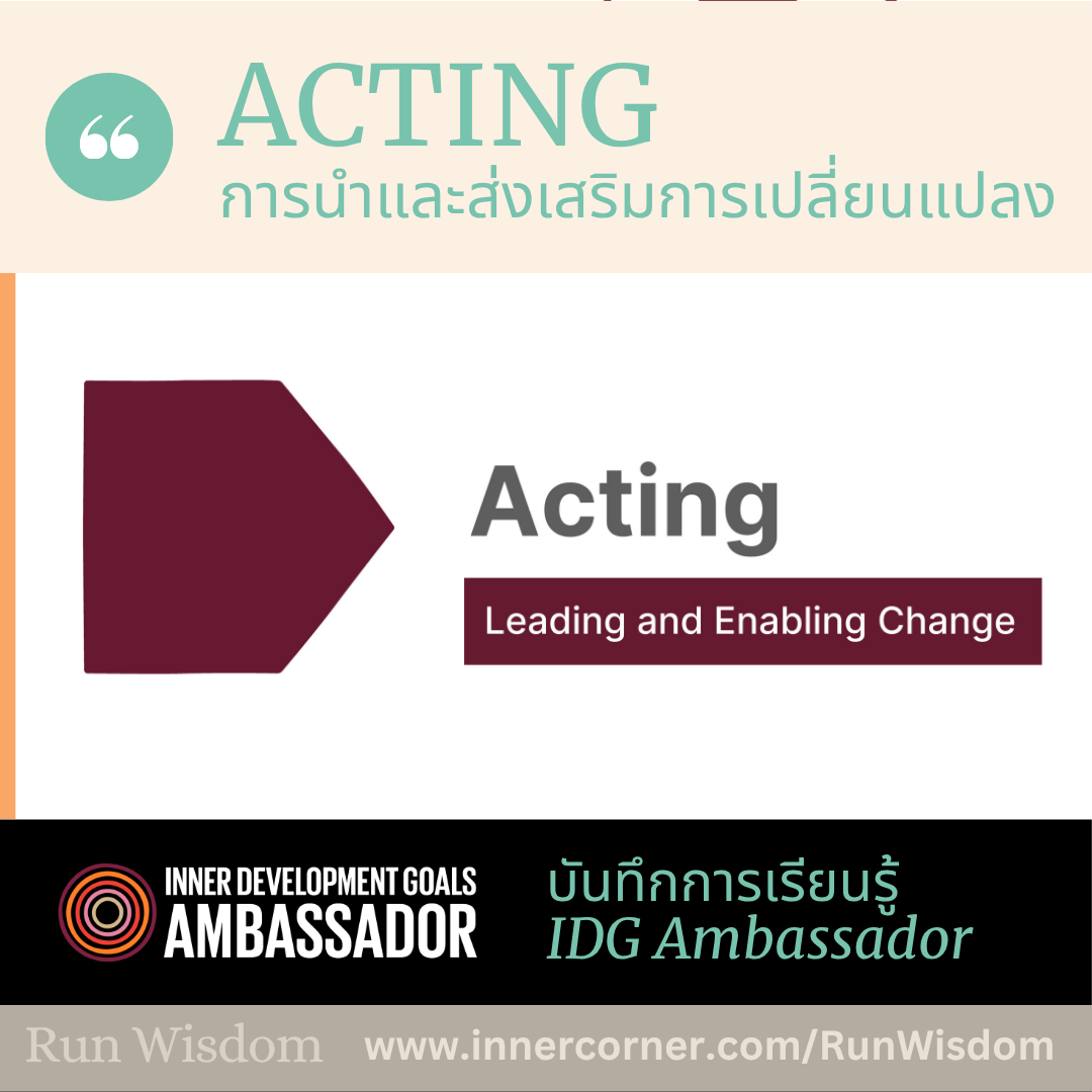 การลงมือทำ - การนำและส่งเสริมการเปลี่ยนแปลง (Acting - Leading and Enabling Change) การก้าวเดินไปข้างหน้าด้วยความกล้าหาญและด้วยทัศนคติเชิงบวก การสร้างพลังร่วม และการลงมือทำด้วยเจตจำนงและมุ่งมั่น เปลี่ยนวิสัยทัศน์ให้กลายเป็นการเปลี่ยนแปลงที่มีความหมายในช่วงเวลาแห่งความไม่แน่นอน (Moving forward with courage and optimism, building collective agency, and acting with purpose and persistence turns visions into meaningful change in uncertain times.)